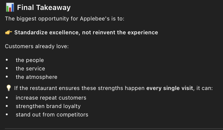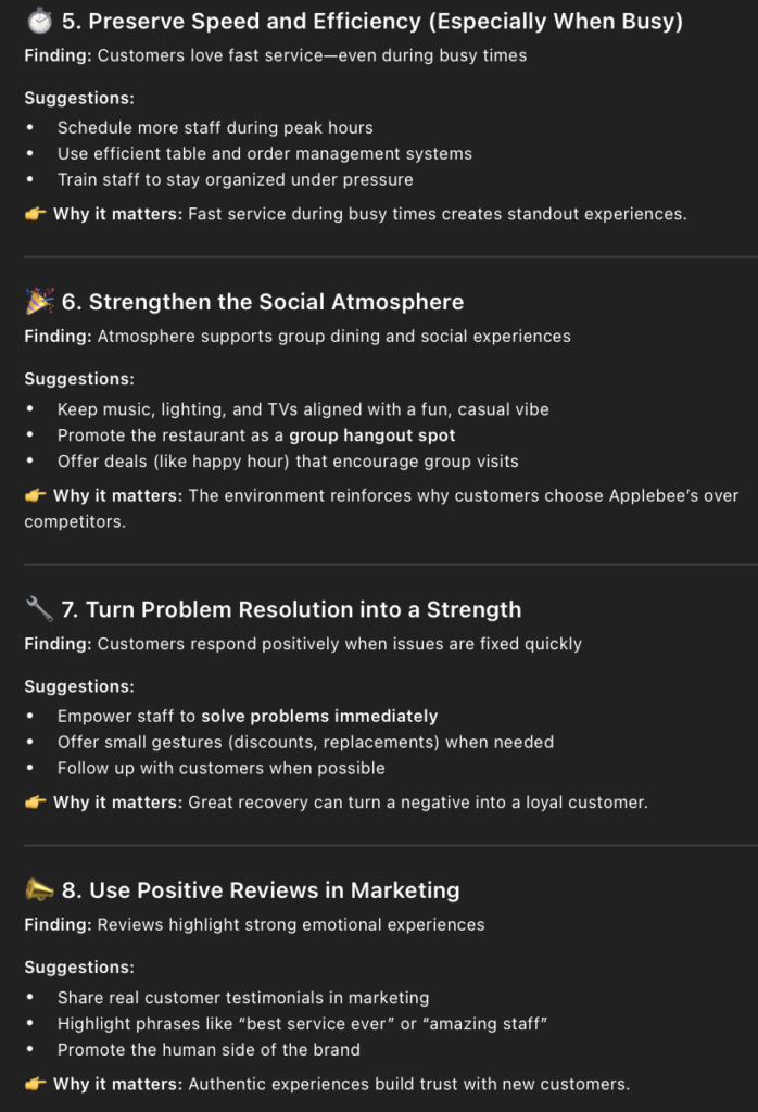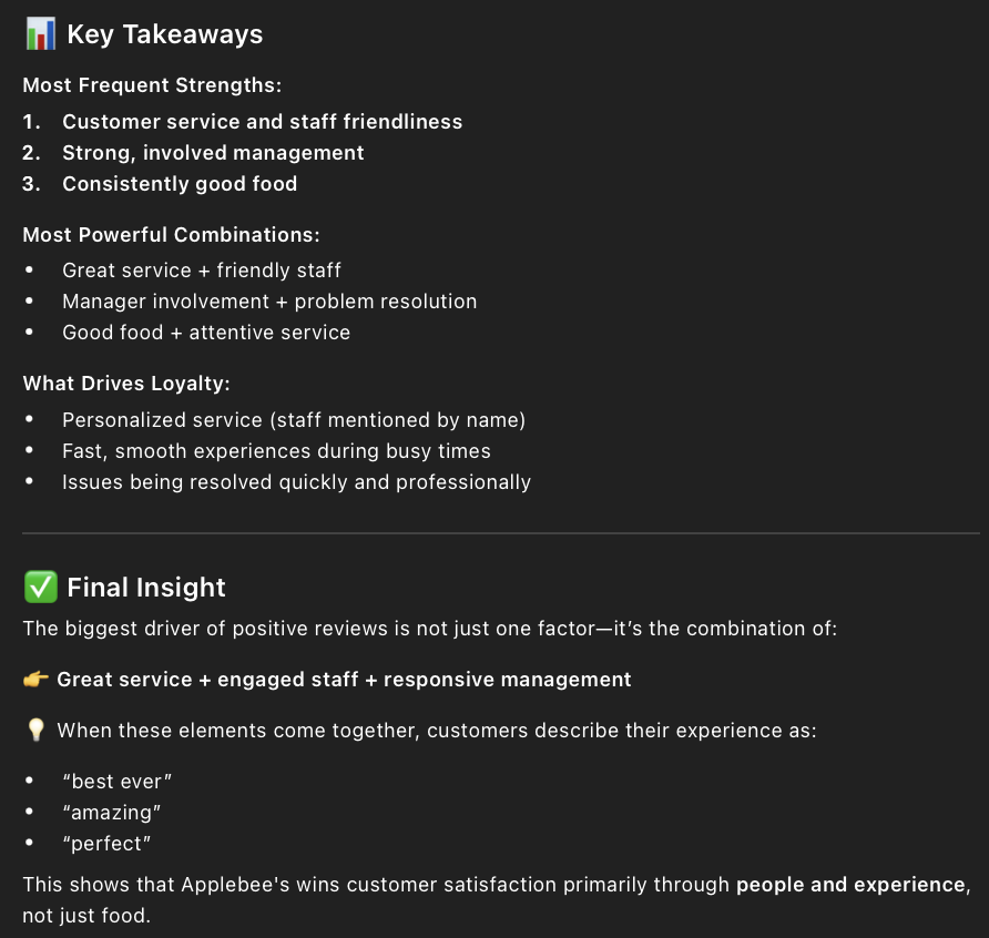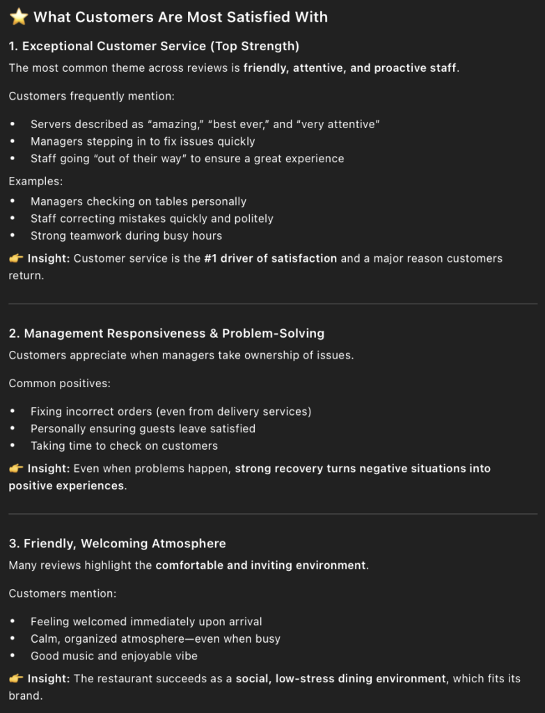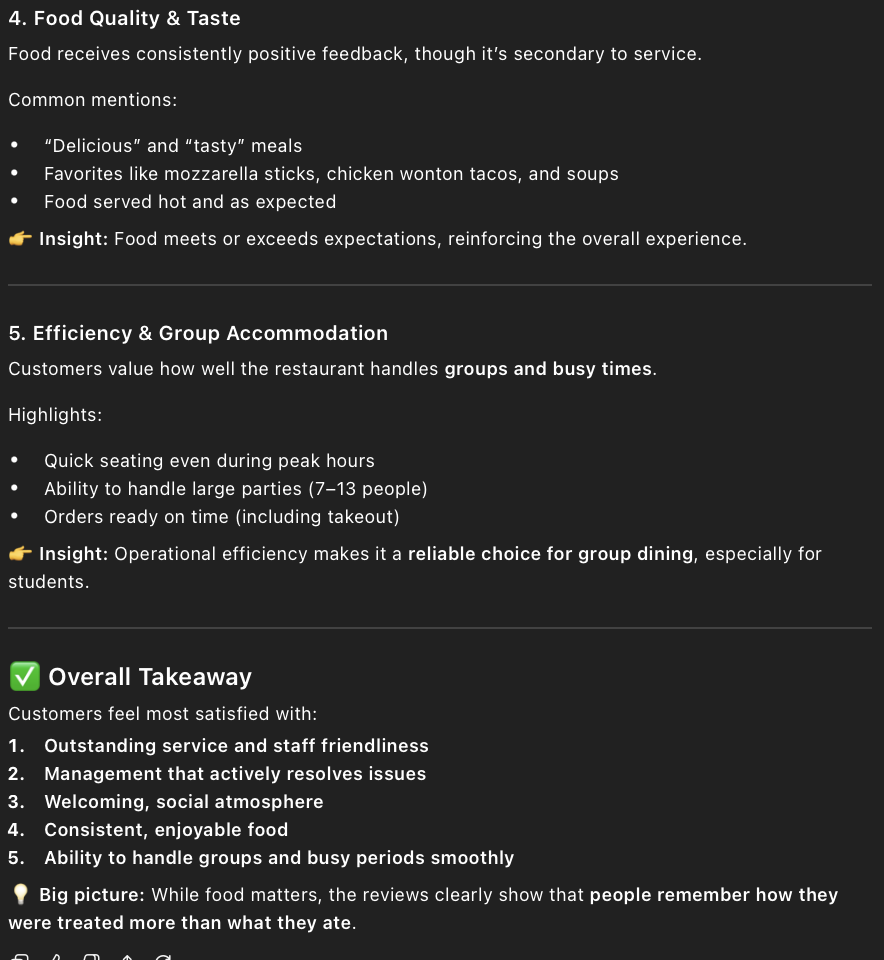 • The prompt I entered into ChatGPT to find out the positives of Applebee’s was, “ What are customers most satisfied with based on the reviews?” I also added a copied list of all the 4 and 5 star reviews.