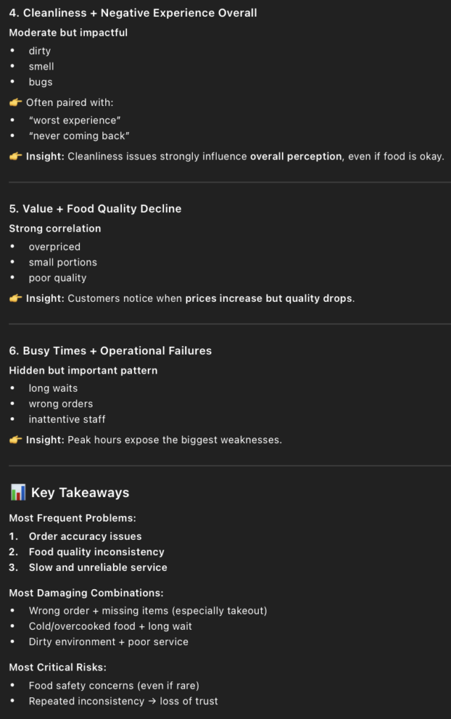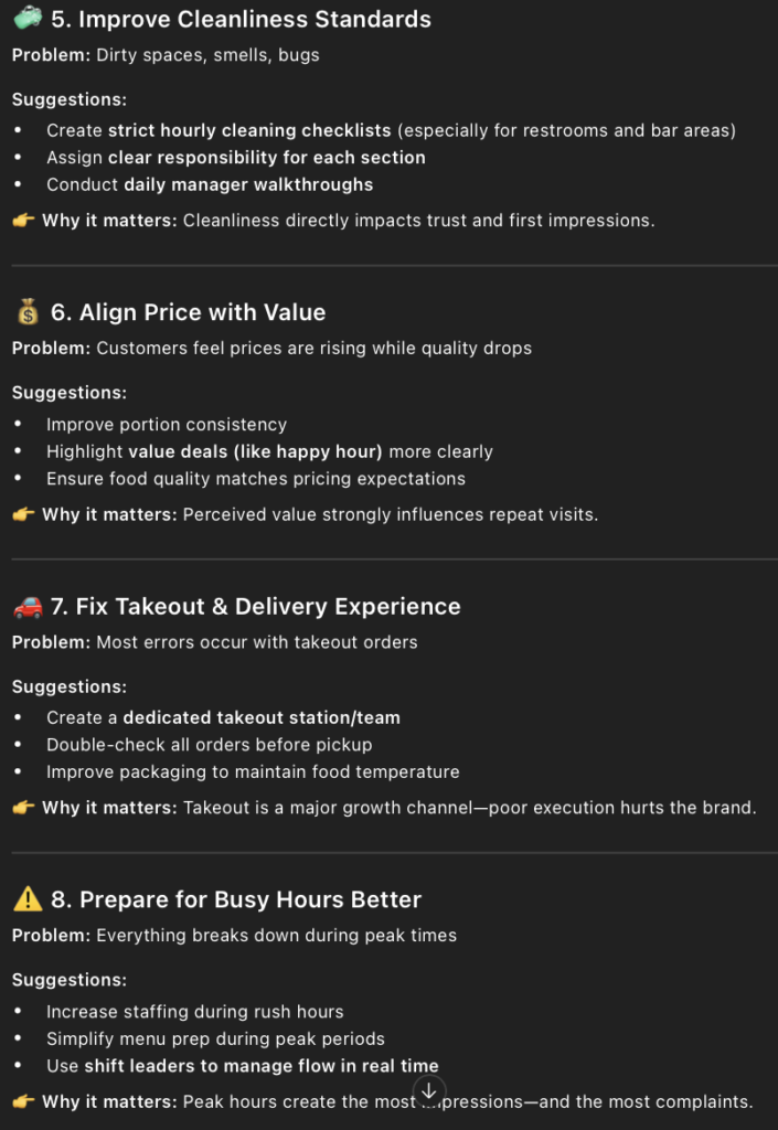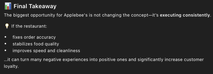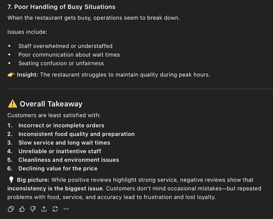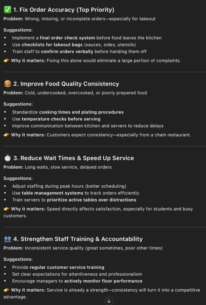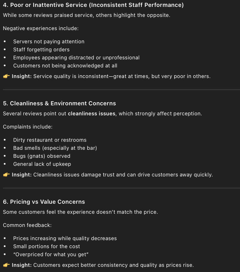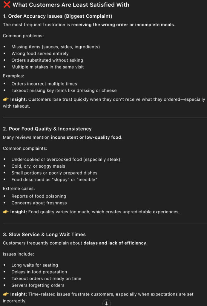 • The prompt I entered into ChatGPT to find out the negatives of Applebee’s was, “ What are customers most dissatisfied with based on the reviews?” I also added a copy of all the 1- and 2-star reviews.