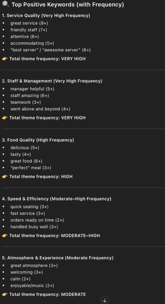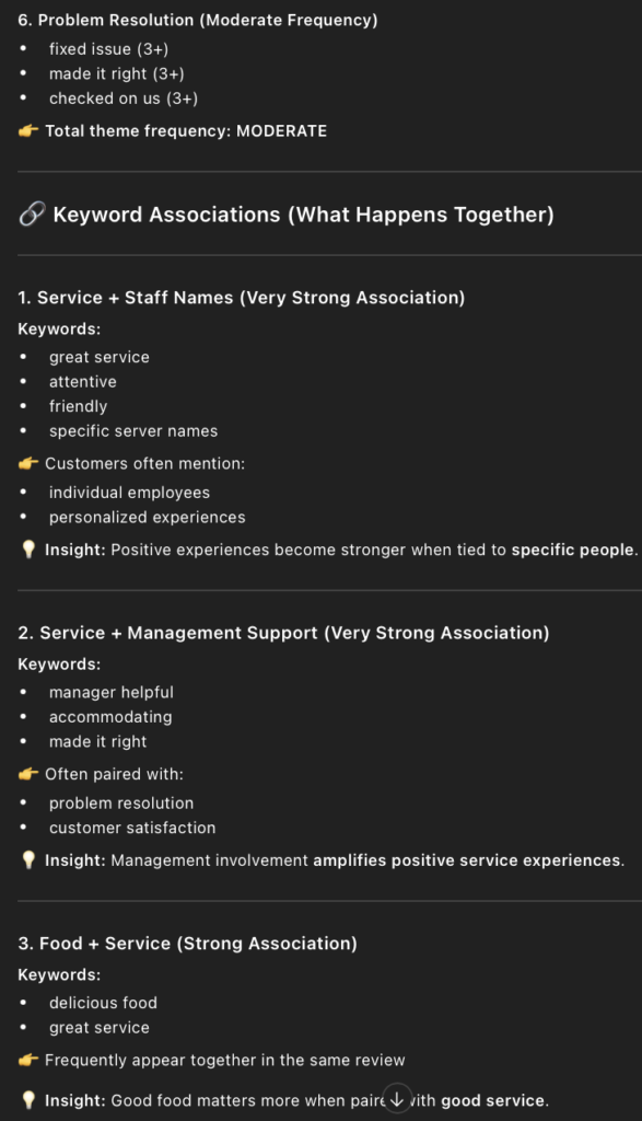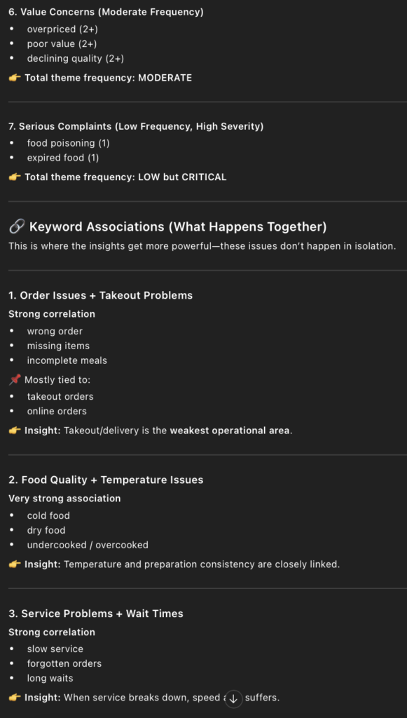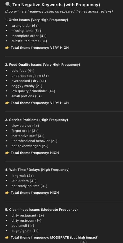• I then used this prompt in ChatGPT, “Extract negative keywords from those reviews, and analyze the frequency and associations of these keywords.”