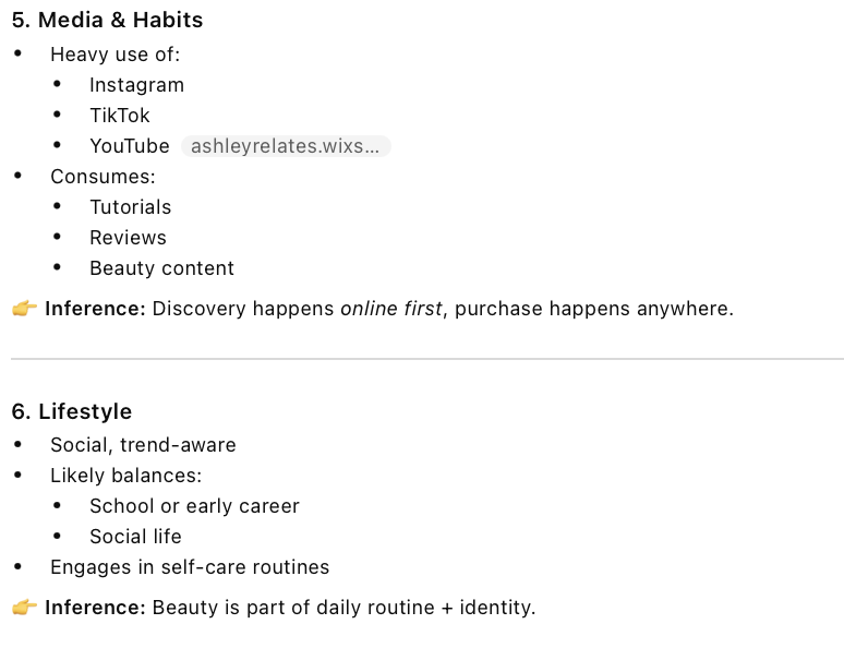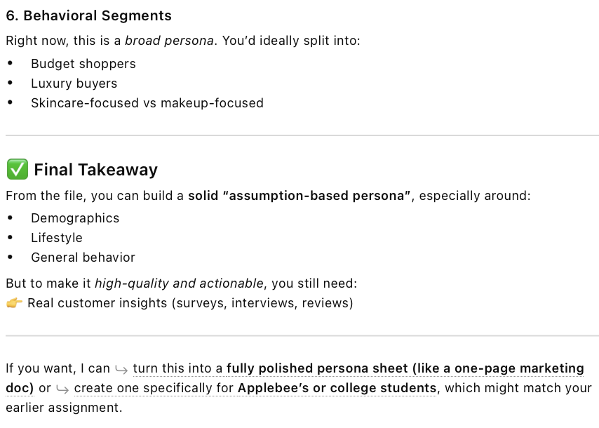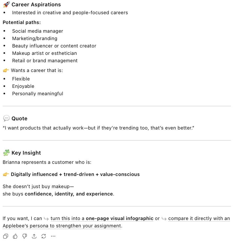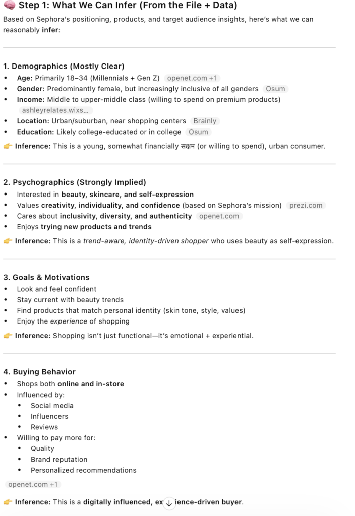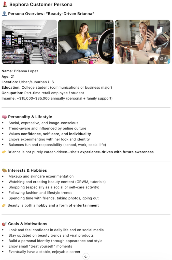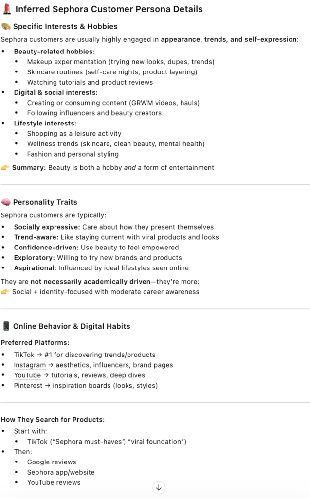 • To make a customer persona specific to Sephora, I used their website link and typed this prompt into ChatGPT: “https://www.inside-sephora.com/en/about-sephora OK, I’ve uploaded a file regarding Applebee’s business. Based on the file, try to infer all the information you need to create a customer persona. Then, also list the information you think is still needed.”