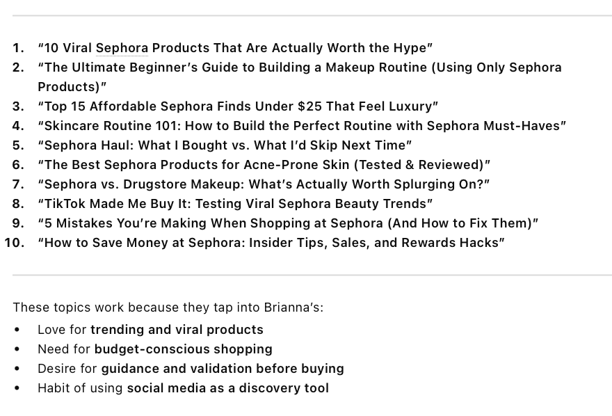 • To help attract customers, people post on social media. To get ideas of what to post, I put the prompt into ChatGPT: “Write 10 blog post ideas about Sephora that the customer persona created earlier is searching for.”