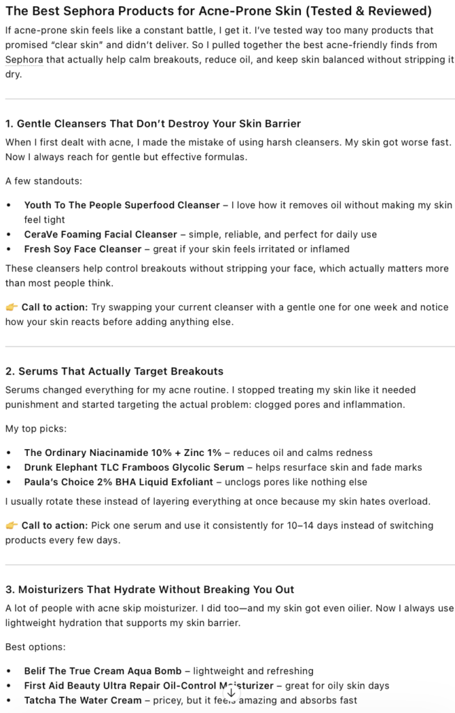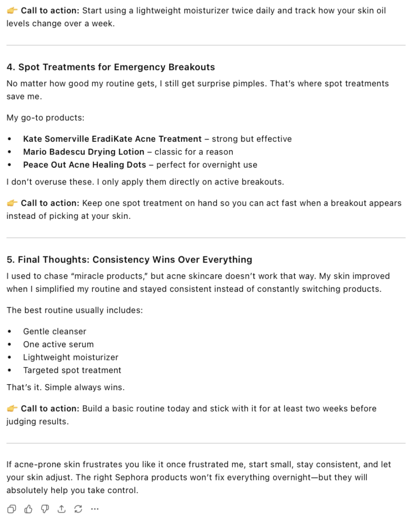 • To create a blog post, I entered this prompt into ChatGPT: “I want you to act as a blogger with expertise on Sephora. You are writing a blog post for “The Best Sephora Products for Acne-Prone Skin (Tested & Reviewed)”. This post should be helpful for people learning about Sephora. There should be a call to action at the end of each section. The blog post will be 500 to 600 words long. The tone will be informal. You should write as an individual blogger with a personal approach, so do not use the plural first-person to refer to yourself. Eg. “our”, or “we”. Only use the singular first-person. Do not use passive voice.”