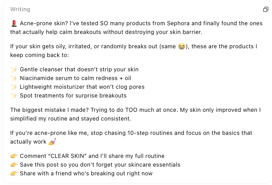 • To get more people’s attention, it is important to have media posts and visuals to capture people’s attention. To create a good social media post, I used this prompt in Chat GPT: “Create an Instagram post regarding ‘The Best Sephora Products for Acne-Prone Skin (Tested & Reviewed) For this customer persona.”