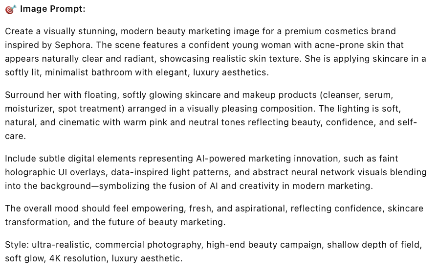 • First, I need ChatGPT to create a prompt to generate a good image prompt for Leonardo AI. This is the prompt I used: “Today, we’ve seen how AI can revolutionize marketing strategies. ChatGPT has shown its potential in creating customer personas, optimizing SEO, and generating content. Remember, these tools are here to enhance our creativity, not replace it. The future of marketing lies in the collaboration between human insight and AI capabilities. Your challenge is to harness this potential and innovate. With these tools at your disposal, you’re ready to lead in the rapidly evolving digital landscape. Create a prompt to generate an impactful image for Sephora.”