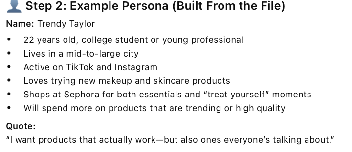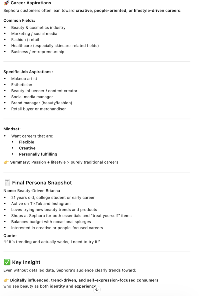 • Last to get a final customer persona for Sephora, I typed this prompt into ChatGPT: “Now, you have all the information to create a customer persona. Using the information in our conversation, create a customer persona for Sephora.”