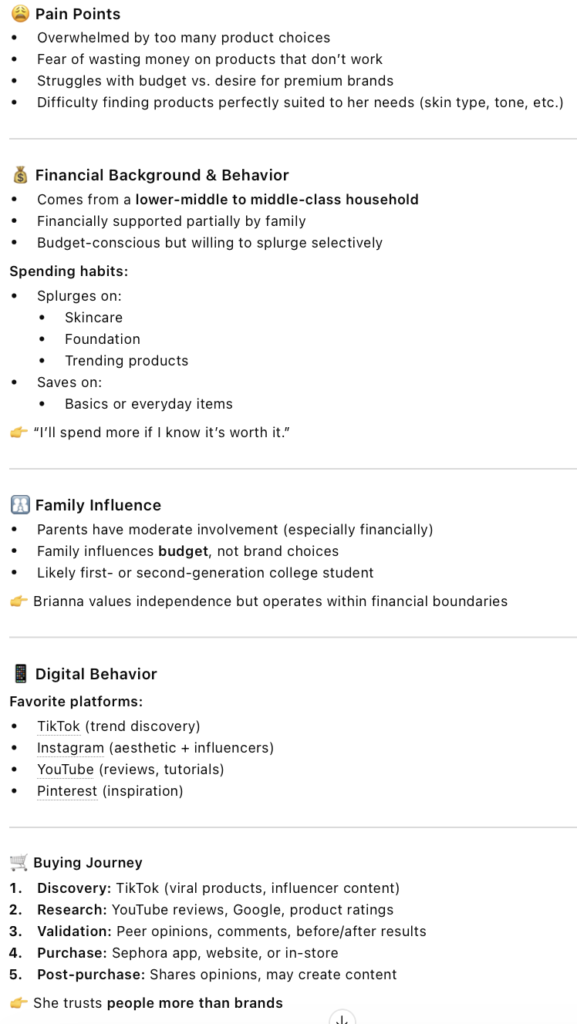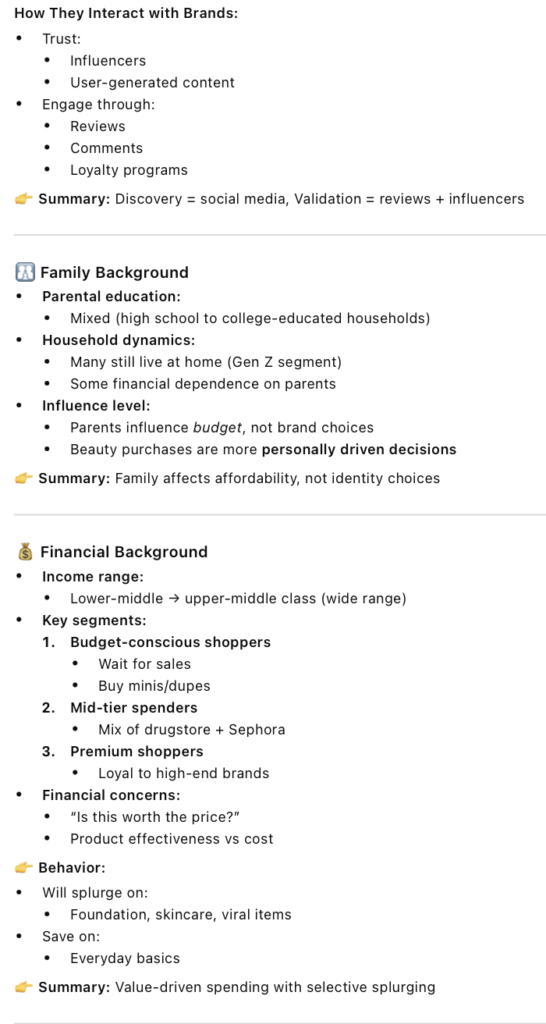 • Next, to find this missing information, I typed in this prompt into ChatGPT: “Regarding the following items, we don’t have detailed information. Based on all the general information available to you, guess what they might be like: Specific Interests & Hobbies: Details about what prospective Sephora Customers might enjoy. Personality Traits: Are they more academically driven, socially active, or career-focused? Detailed outline behavior: Which social media platforms do they prefer? How do they search for and interact with educational institutions online? Family Background: Information about parental education levels and involvement in the decision-making process. Financial Background: More granular details about family income levels and financial concerns. Careers Aspirations: Specific job roles or industries they aspire to work in after graduation.”