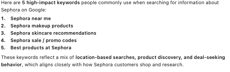• It is important to understand what customers want from a company to succeed. A good way to figure out how to cater to an audience is to see what they are looking for. To better understand Sephora’s customers, I typed this prompt into ChatGPT: ” Make a list of the top 5 keywords people use to find information about Sephora on Google. In a numbered list.”